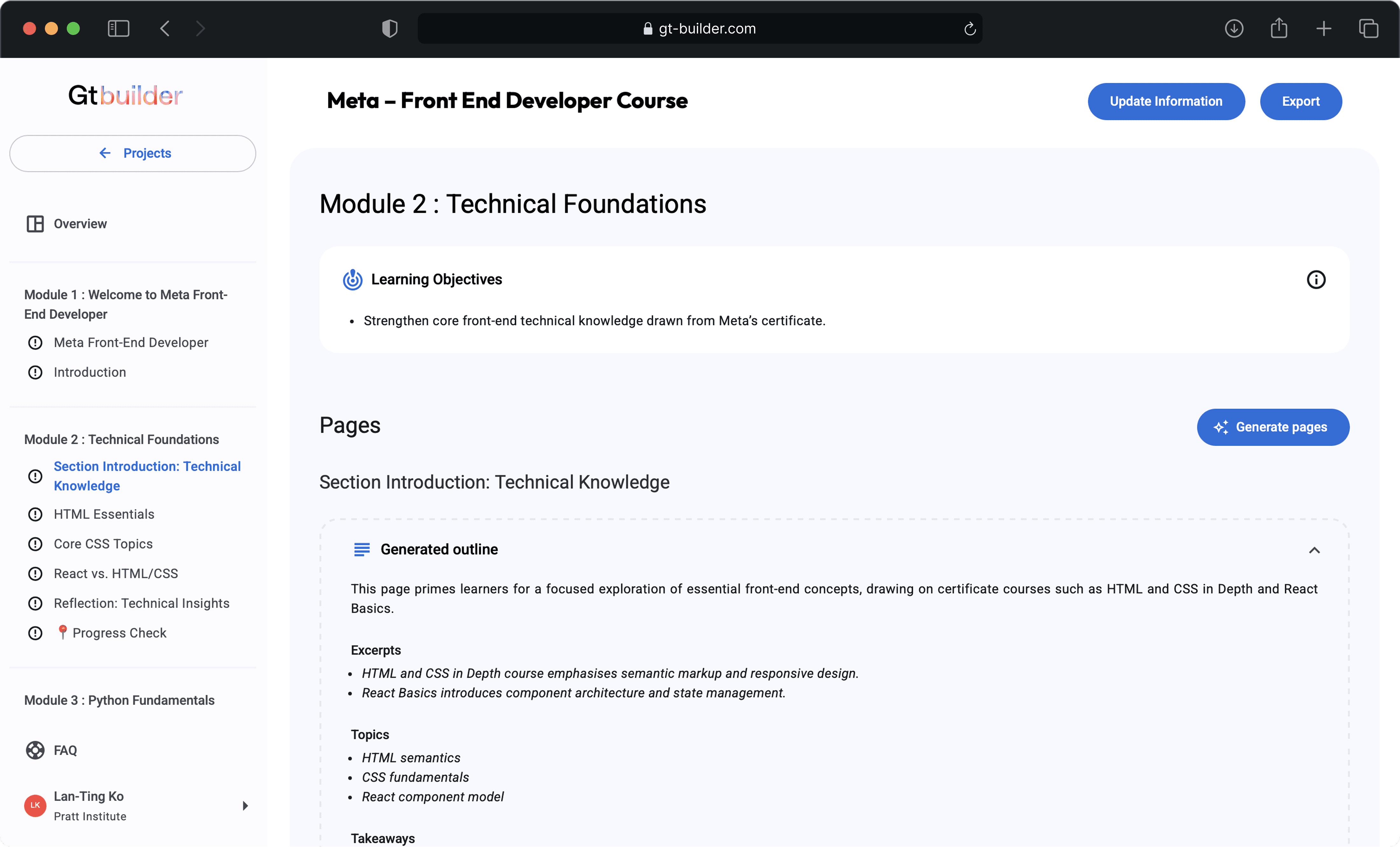 Generate page content based on the outline for each module